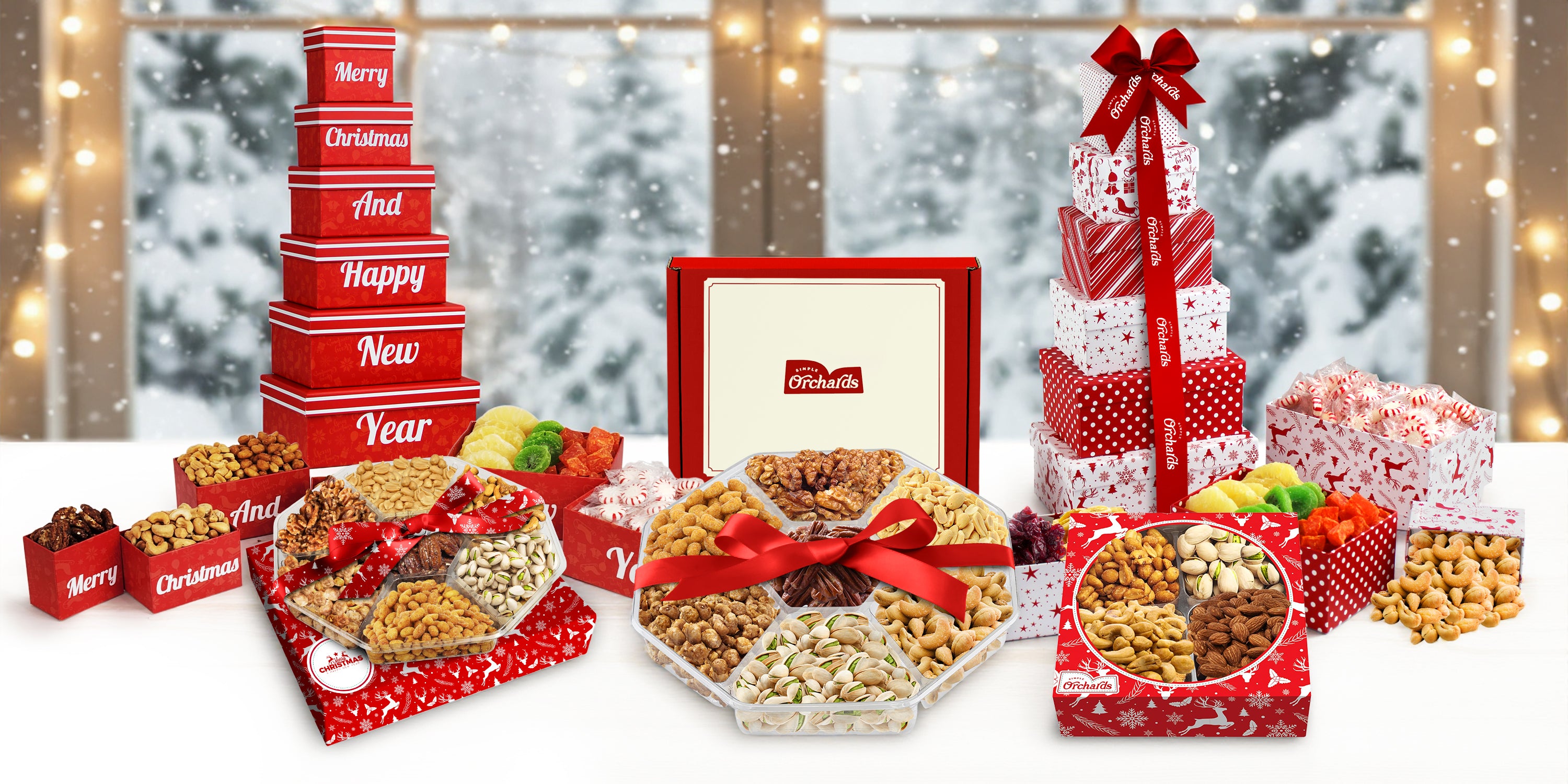 Christmas Nuts Gift Basket for Holiday Season, Premium Mixed Nut Assortment Gift Gourmet Snack Food Present Box, Vegan, Organic and Kosher - Christmas Gift Basket for Family (4 Sectional)