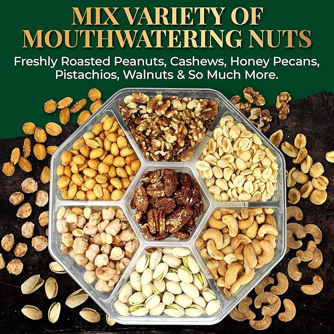 - Holiday Gift Basket: This nut care package is going to be a massive hit. This 7 section platter contains a variety of mouthwatering nuts; all beautifully presented in a high-end gift box. perfect for a Holiday Gift Basket & mother's day gift for wife.