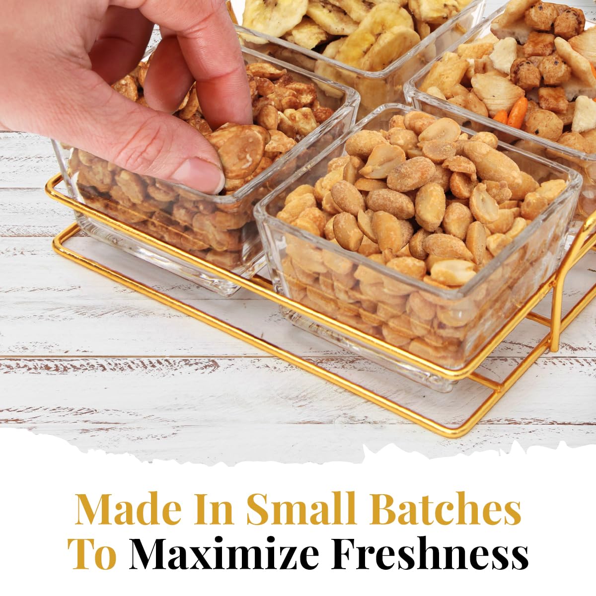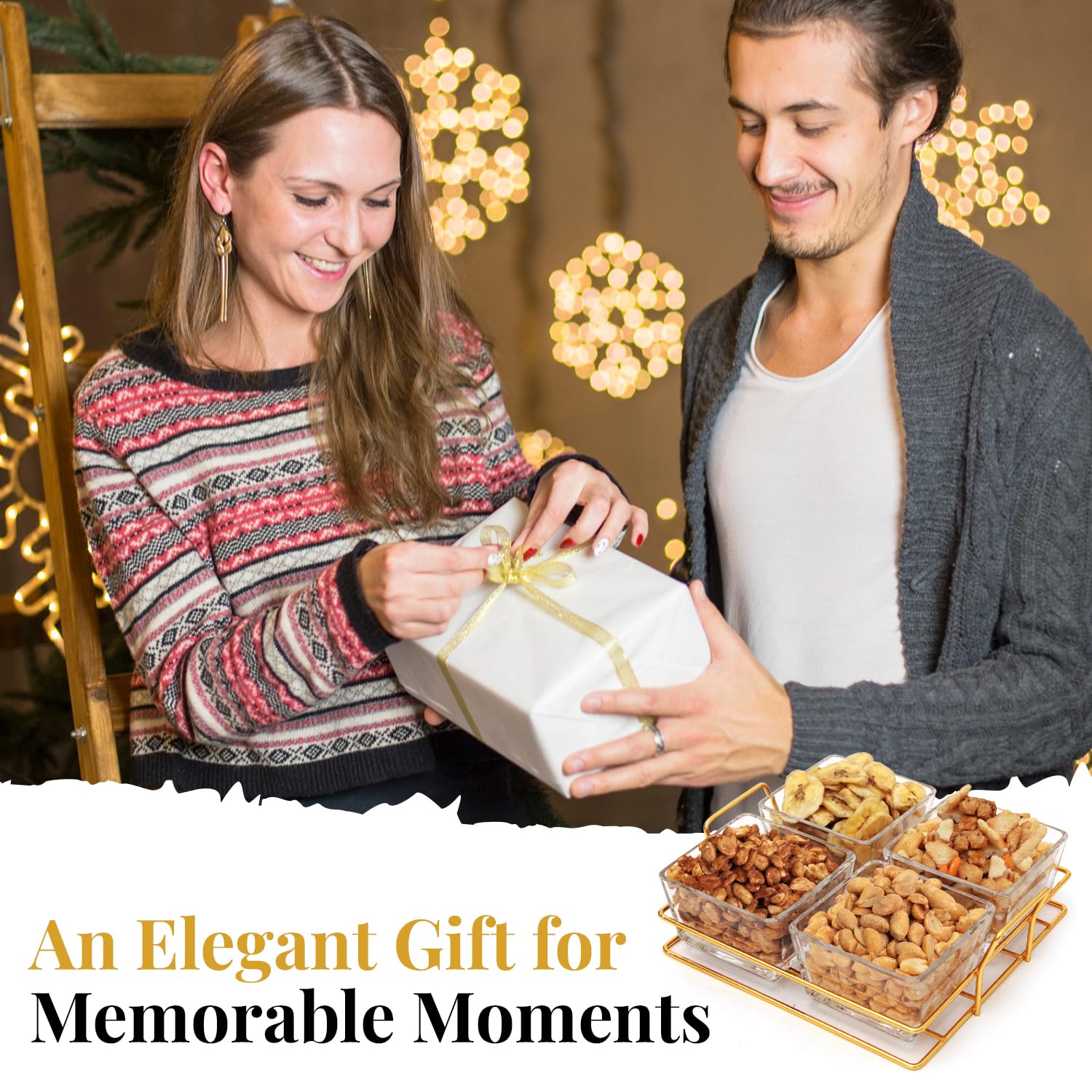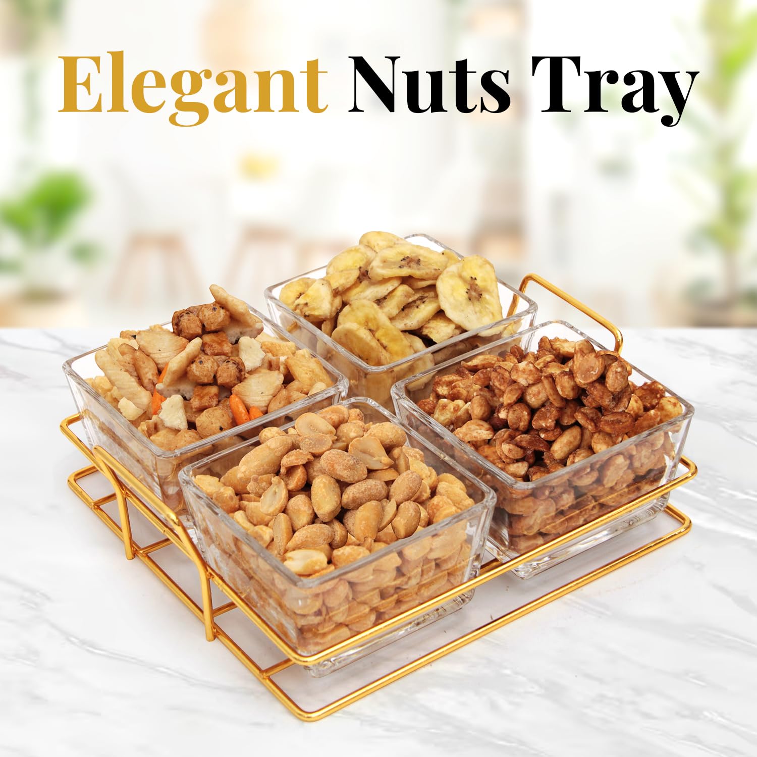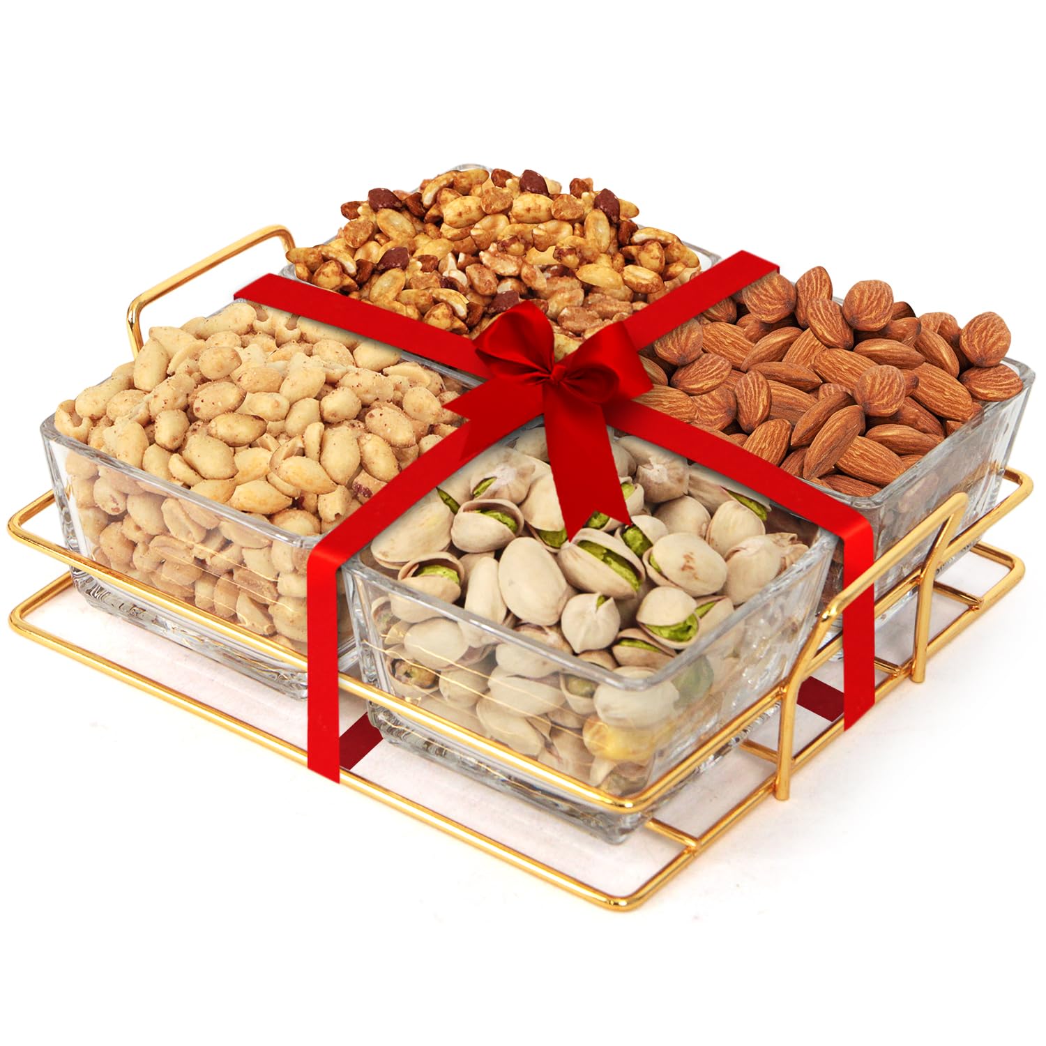 Nuts Gift Basket in Glass Tray: This premium nut gift basket is the ultimate in style and indulgence, featuring a beautifully crafted glass tray divided into three sections. Ideal as a food gift for adults, this nuts gift box combines exceptional taste with an exquisite presentation, making it a standout choice for celebrations, gatherings or simply as a thoughtful gift for loved ones.